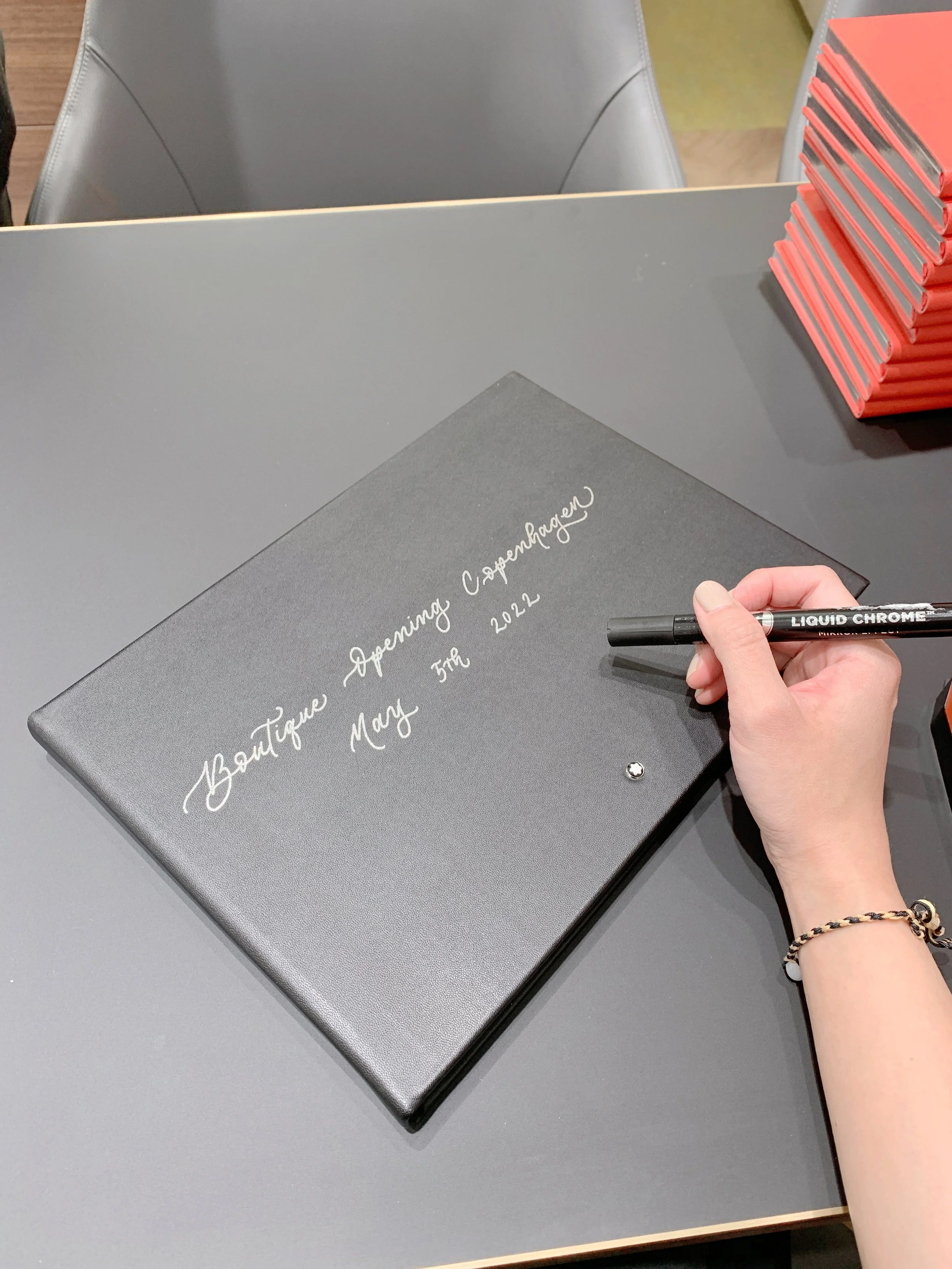 Som en professionel kalligraf bringer jeg en unik elegance til din begivenhed med min on-site ydelse. Håndskrevede objekter er ikke bare en trend; det er en oplevelse. Man kan i se, hvordan ens valgte genstande – om det er elegante læderpunge, stilfulde notesbogomslag eller festlige julekugler – smukt bliver forvandlet med deres navne eller initialer. Og glæden slutter ikke der. De får fornøjelsen af at tage disse personlige genstande med hjem samme dag.